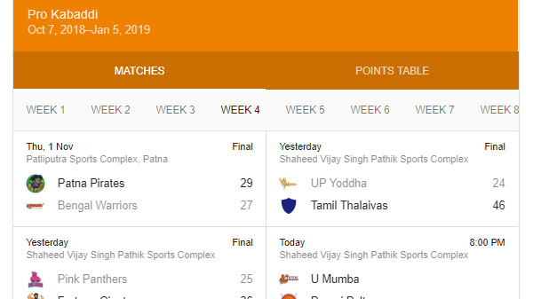ಈ ಹಿಂದೆ ಕೇವಲ ಕ್ರಿಕೆಟ್ ಪಂದ್ಯದ ಮಾಹಿತಿ ಹಾಗೂ ಪಂದ್ಯದ ಸ್ಕೋರ್ ಕುರಿತ ಮಾಹಿತಿಯನ್ನು ಗೂಗಲ್ ನಲ್ಲಿ ಕಾಣಬಹುದಾಗಿತ್ತು. ಆದರೆ ಇನ್ನು ಮುಂದೆ ಇದೇ ಮಾದರಿಯಲ್ಲಿ ನೀವು ಗೂಗಲ್ ನಲ್ಲಿ ಪ್ರೋ ಕಬ್ಬಡಿ ಲೀಗ್ ಪಂದ್ಯಗಳ ಸಂಪೂರ್ಣ ಮಾಹಿತಿಯನ್ನು ಪಡೆದುಕೊಳ್ಳಬಹುದಾಗಿದೆ. ಇದರಿಂದಾಗಿ ನಿಮ್ಮ ಕಬ್ಬಡಿ ಪಂದ್ಯದ ಪ್ರೀತಿಯೂ ಇನ್ನಷ್ಟು ಹೆಚ್ಚಾಗಲಿದೆ.