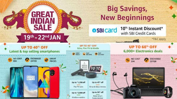 ಅಮೇಜಾನಿನ ಗ್ರೇಟ್ ಇಂಡಿಯನ್ ಸೇಲ್ ಜನವರಿ 19 ರಿಂದ ಆರಂಭವಾಗಲಿದ್ದು ಜನವರಿ 22,2020 ರ ವರಗೆ ನಡೆಯಲಿದೆ.ಈ ಸೇಲ್ ದೊಡ್ಡ ರಿಯಾಯಿತಿಗಳನ್ನು ನೀಡುತ್ತಿದ್ದು ಎಲೆಕ್ಟ್ರಾನಿಕ್ ಮತ್ತು ಮನೆ ಬಳಕೆ ವಸ್ತುಗಳು ಭಾರೀ ಕಡಿಮೆ ಬೆಲೆಯಲ್ಲಿ ಸಿಗುತ್ತದೆ.