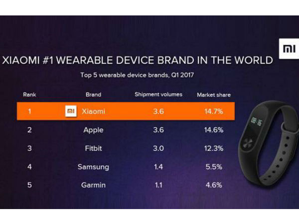 ವಿಶ್ವದ ಟಾಪ್ 5 ವೆರಬಲ್ ಕಂಪನಿಗಳಲ್ಲಿ ಸಾಲಿನಲ್ಲಿ ಮೊದಲ ಸ್ಥಾನದಲ್ಲಿ ಶಿಯೋಮಿ ಇದ್ದು, ನಂತರದ ಸ್ಥಾನದಲ್ಲಿ ಆಪಲ್, ಫಿಟ್ ಬಿಟ್, ಸ್ಯಾಮ್ಸಂಗ್ ಮತ್ತು ಗಾರ್ಮಿನ್ ಕಂಪನಿಗಳನ್ನು ಕಾಣಬಹುದಾಗಿದೆ.