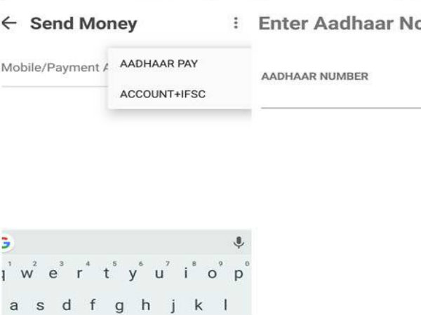 ಭೀಮ್ ಆಪ್ ತೆರೆದು ಸೆಂಡ್ ಮನಿ ಎಂಬ ಐಕಾನ್ ಕ್ಲಿಕ್ ಮಾಡಿ. ನಂತರ ನಿಮಗೆ "ಆಧಾರ್ ಪೇ" ಮತ್ತು "ಅಕೌಂಟ್ ಐಎಫ್ಎಸ್ಸಿ" ಎಂಬ ಎರಡು ಆಯ್ಕೆಗಳು ತೆರೆದುಕೊಳ್ಳುತ್ತವೆ.