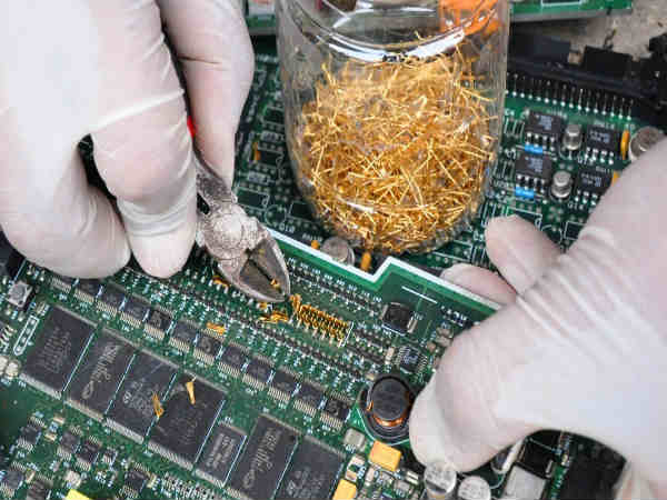 ತ್ಯಾಜ್ಯ ಎಲೆಕ್ಟ್ರಾನಿಕ್ಸ್ ಬೋರ್ಡ್ಗಳನ್ನು ಪರಿಶೋಧನೆ ಒಂದು ಆಸೀಡ್ನಲ್ಲಿ ಮುಳುಗಿಲಾಗುತ್ತದೆ. ಇದರಿಂದ ಬೋರ್ಡ್ನಲ್ಲಿದ್ದ ಎಲ್ಲಾ ಲೋಹ ಆಸಿಡ್ ನಲ್ಲಿ ಕರಗಿ ಹೋಗುತ್ತದೆ. ನಂತರ ಆ ಆಸಿಡ್ನಲ್ಲಿ ಕರಗಿದ್ದ ಲೋಹಗಳನ್ನು ಎಣ್ಣೆಯುಕ್ತ ದ್ರವಗಳ ಮೂಲಕ ಬೇರ್ಪಡಿಸಿ ಚಿನ್ನವನ್ನು ಶೇಖರಣೆ ಮಾಡುತ್ತಾರೆ. ಇದರಿಂದ ಚಿನ್ನ ರೀಸೈಕಲ್ ಮಾಡಿದ ಹಾಗೆ ಆಗುತ್ತದೆ.