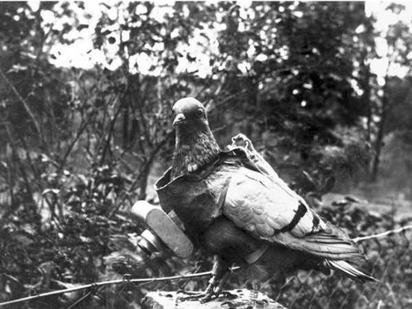 ಜರ್ಮನ್ನ 'ಜೂಲಿಯಸ್ ನ್ಯೂಬ್ರೌನರ್' ಯುದ್ಧ ಸಂದರ್ಭದಲ್ಲಿ ಸುತ್ತಲ ಪ್ರದೇಶದ ಚಿತ್ರ ಸೆರೆಹಿಡಿಯಲು ಪಾರಿವಾಳಕ್ಕೆ ಸಣ್ಣ ಕ್ಯಾಮೆರಾವನ್ನು ವ್ಯವಸ್ಥೆಗೊಳಿಸಿರುವ ಫೋಟೋ. ಆ ಸಂದರ್ಭದಲ್ಲಿ ಟೈಮರ್ ಮೆಕಾನಿಷಮ್ ಶಟರ್ ಕ್ಲಿಕ್ ಮಾಡಲು ಉಪಯೋಗವಾಗುತ್ತಿತ್ತು.