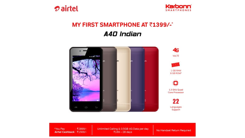 ಕಾರ್ಬನ್ A40 ಇಂಡಿಯನ್ ಸ್ಮಾರ್ಟ್ಫೋನ್ ಏರ್ಟೆಲ್ ನೊಂದಿಗೆ ಕಾಣಿಸಿಕೊಂಡಿದೆ. ಜಿಯೋ ಫೋನ್ ಒಂದು ಮಾದರಿಯಲ್ಲಿ ಉಚಿತ ಎನ್ನುವ ಮಾದರಿಯಲ್ಲಿಯೇ ಏರ್ಟೆಲ್-ಕಾರ್ಬನ್ ಫೋನ್ ಸಹ ಒಂದು ಮಾದರಿಯಲ್ಲಿ ರೂ.1399ಕ್ಕೆ ದೊರೆಯುತ್ತಿದೆ.