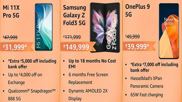 ಸದ್ಯದ ಆಫರ್ನಲ್ಲಿರುವ ಫೋನ್ಗಳು 5G ನೆಟ್ವರ್ಕ್ಗೆ ಬೆಂಬಲದೊಂದಿಗೆ ಟ್ರಿಪಲ್ ಕ್ಯಾಮೆರಾ ಸೆಟಪ್ನಂತಹ ಟೆಕ್ನಾಲಜಿಯನ್ನು ಒಳಗೊಂಡಿದೆ. ಆದ್ದರಿಂದ, ನೀವು ಸ್ಯಾಮ್ಸಂಗ್ ಗೆಲ್ಯಾಕ್ಸಿ Z ಫೊಲ್ಡ್ 3, ಸ್ಯಾಮ್ಸಂಗ್ ಗೆಲ್ಯಾಕ್ಸಿ S21 5G, ಒನಪ್ಲಸ್ 9 ಮತ್ತು ಸ್ಯಾಮ್ಸಂಗ್ ಗೆಲ್ಯಾಕ್ಸಿ S20 FE 5G ನಂತಹ ಪ್ರೀಮಿಯಂ ಸ್ಮಾರ್ಟ್ಫೋನ್ಗಳನ್ನು ಕಡಿಮೆ ಬೆಲೆಗೆ ಪಡೆಯಬಹುದು. ಅಮೆಜಾನ್ ಗ್ರೇಟ್ ಇಂಡಿಯನ್ ಫೆಸ್ಟಿವಲ್ ಸೇಲ್ 2021 ರ ಎಲ್ಲಾ ಹಾಟ್ ಪಿಕ್ಸಗಳು ಇಲ್ಲಿವೆ.