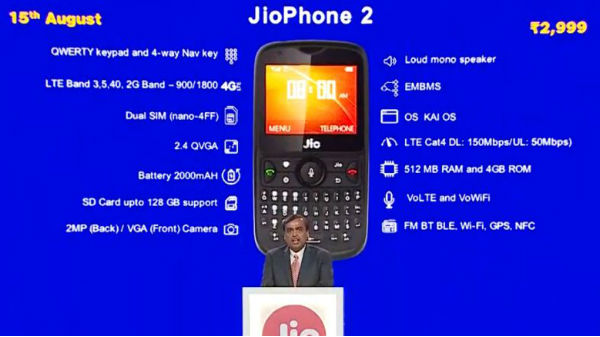 2016ರಲ್ಲಿ ಲಾಂಚ್ ಆದ ಜಿಯೋ ಫೋನ್ ಕೇವಲ ರೂ.1500ಕ್ಕೆ ಲಭ್ಯವಿತ್ತು. ಈ ಬಾರಿ ಲಾಂಚ್ ಆಗಲಿರುವ ಜಿಯೋ ಫೋನ್ 2 ರೂ.2,999ಕ್ಕೆ ಮಾರಾಟವಾಗಲಿದೆ. 4G VoLTE, FM ರೇಡಿಯೋ, ವೈ-ಫೈ, GPS ಮತ್ತು NFC ಫೀಚರ್ಗಳನ್ನು ಹೊಂದಿದೆ. 2000 mAh ಬ್ಯಾಟರಿ ಸಾಮರ್ಥ್ಯ ಹೊಂದಿದ್ದು, ಫೀಚರ್ ಫೋನ್ನಲ್ಲಿ ಬೆಸ್ಟ್ ಎನಿಸಬಹುದು.
