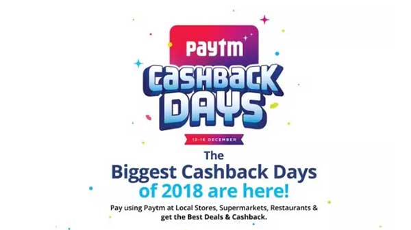 ಇ-ಕಾಮರ್ಸ್ ಫ್ಲ್ಯಾಟ್ ಫಾರ್ಮ್ ಪೇಟಿಎಂ ಡಿಸೆಂಬರ್ 12 ರಿಂದ 16 ರ ವರೆಗೆ ಪೇಟಿಎಂ ಕ್ಯಾಷ್ ಬ್ಯಾಕ್ ಡೇಸ್ ನ್ನು ಪ್ರಕಟಿಸಿದೆ. ಐದು ದಿನದ ಈ ಸೇಲ್ ನಲ್ಲಿ ಗ್ರಾಹಕರು ಸ್ಮಾರ್ಟ್ ಫೋನ್, ಲ್ಯಾಪ್ ಟಾಪ್, ಮನೆಯ ಉಪಕರಣಗಳು ಮತ್ತು ಫ್ಯಾಷನ್ ಸೇರಿದಂತೆ ಬೇರೆಬೇರೆ ವಿಭಾಗದ ವಸ್ತುಗಳಿಗೆ ಭರ್ಜರಿ ಕ್ಯಾಷ್ ಬ್ಯಾಕ್ ಆಫರ್ ನ್ನು ಪಡೆಯಬಹುದು. ಗ್ರಾಹಕರು ಕೆಲವು ಸ್ಮಾರ್ಟ್ ಫೋನ್ ಗಳ ಖರೀದಿಯಲ್ಲಿ 5,000 ರುಪಾಯಿ ಮತ್ತು ಲ್ಯಾಪ್ ಟಾಪ್ ಗಳ ಖರೀದಿಯಲ್ಲಿ 20,000 ರುಪಾಯಿ ವರೆಗೆ ಕ್ಯಾಷ್ ಬ್ಯಾಕ್ ಮತ್ತು ಮನೆಯ ಸಲಕರಣೆಗಳು ಮೇಲೂ ಕೂಡ 20,000 ರುಪಾಯಿ ವರೆಗೆ ಕ್ಯಾಷ್ ಬ್ಯಾಕ್ ಪಡೆಯುವ ಅವಕಾಶವಿದೆ.