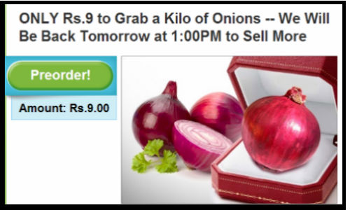 ದೆಹಲಿ ಮೂಲದ ಆನ್ಲೈನ್ ಖರೀದಿ ತಾಣ ಗ್ರೂಪನ್ ಇಂಡಿಯಾ ಈ ಹೊಸ ಆಫರ್ ಪ್ರಕಟಿಸಿದ್ದು ಆನ್ಲೈನ್ಲ್ಲೇ ಈರುಳ್ಳಿಯನ್ನು ಪ್ರಿ ಆರ್ಡರ್ ಮಾಡಿ ಖರೀದಿಸಬಹುದು.