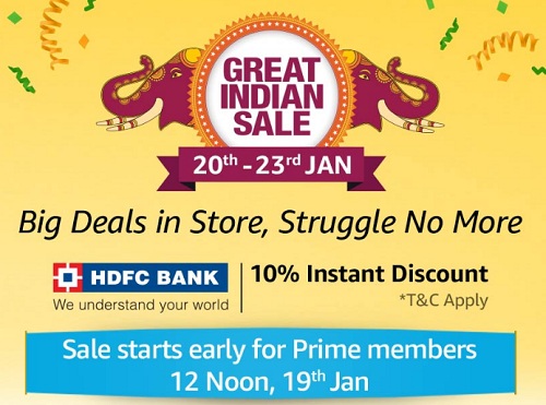 ಅಮೇಜಾನ್ ಆಯೋಜಿಸಿರುವ ದಿ ಗ್ರೇಟ್ ಇಂಡಿಯನ್ ಸೇಲ್ ಜನವರಿ 20 ರಿಂದ ಜನವರಿ 23ರ ವರೆಗೆ, ಅಂದರೆ ಮೂರುದಿನಗಳ ಕಾಲ ನಡೆಯಲಿದೆ. ವಿಭಿನ್ನ ಕೆಟಗರಿಯ ಸುಮಾರು 170 ಮಿಲಿಯನ್ ಪ್ರೊಡಕ್ಟ್ ಗಳ ಸೇಲ್ ಇದರಲ್ಲಿ ಇರಲಿದೆದೆ ಮತ್ತು ಅಮೆಜಾನ್ ಪ್ರೈಮ್ ಸದಸ್ಯರಿಗೆ ವಿಶೇಷ ರಿಯಾಯಿತಿ ಕೂಡ ದೊರೆಯುತ್ತದೆ ಎಂದು ಅಮೆಜಾನ್ ಜಾಹಿರಾತು ನೀಡಿದೆ.