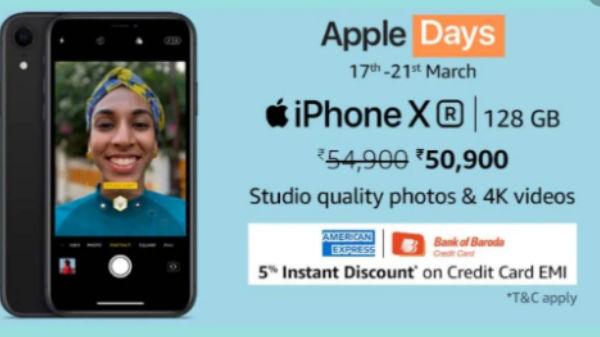 ಆಪಲ್ ಸಂಸ್ಥೆಯ ಜನಪ್ರಿಯ ಐಫೋನ್ XR ಸ್ಮಾರ್ಟ್ಫೋನ್ ಸಹ ಈ ಸೇಲ್ ಮೇಳದಲ್ಲಿ ಡಿಸ್ಕೌಂಟ್ ಪಡೆದಿದೆ. 128GB ಆಂತರಿಕ ಸ್ಟೋರೇಜ್ ವೇರಿಯಂಟ್ 50,900ರೂ ಪ್ರೈಸ್ಟ್ಯಾಗ್ನಲ್ಲಿ ಗುರುತಿಸಿಕೊಂಡಿದೆ. ಎಚ್ಡಿಎಫ್ಸಿ ಕಾರ್ಡ್ ಬಳಸಿ ಖರೀದಿಸಿದರೇ ಹೆಚ್ಚುವರಿ ರಿಯಾಯಿತಿ ಸಿಗಲಿದೆ.