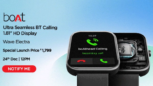 ಬೋಟ್ ವೇವ್ ಎಲೆಕ್ಟ್ರಾ ಸ್ಮಾರ್ಟ್ವಾಚ್ ಭಾರತದಲ್ಲಿ 1,799ರೂ. ಬೆಲೆಯನ್ನು ಹೊಂದಿದೆ. ಈ ಸ್ಮಾರ್ಟ್ವಾಚ್ ಕಪ್ಪು, ನೀಲಿ ಮತ್ತು ಗುಲಾಬಿ ಬಣ್ಣದ ಆಯ್ಕೆಗಳಲ್ಲಿ ಬರಲಿದೆ. ಇನ್ನು ಈ ಸ್ಮಾರ್ಟ್ ವಾಚ್ನ ಫಸ್ಟ್ ಸೇಲ್ ಅಮೆಜಾನ್ ಮೂಲಕ ಇದೇ ಡಿಸೆಂಬರ್ 24 ರಿಂದ ಪ್ರಾರಂಭವಾಗಲಿದೆ.