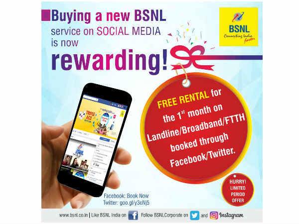 ನೀವು BSNL ಸೇವೆಗಳನ್ನು ಬುಕ್ ಮಾಡಬಹುದಾಗಿದೆ. ಫೇಸ್ಬುಕ್ ಮೂಲಕವೇ ಲ್ಯಾಂಡ್ ಲೈನ್ ಸೇವೆಯನ್ನು ಹಾಗೂ ಬ್ರಾಡ್ ಬ್ಯಾಂಡ್ ಸೇವೆಯನ್ನು ಖರೀದಿ ಮಾಡಬಹುದಾಗಿದೆ. ಇದು ಲಿಮಿಟೆಡ್ ಆಫರ್ ಆಗಿದೆ.