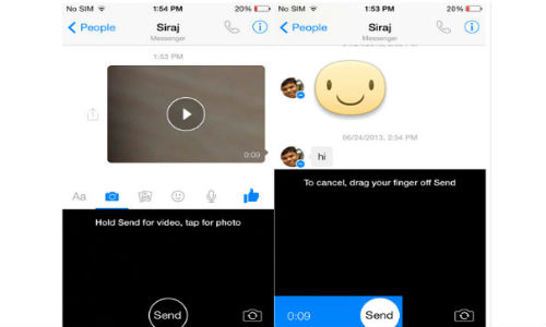 ಬಳಕೆದಾರರು ವೀಡಿಯೋಗಳನ್ನು ಕಳುಹಿಸಲು ಟ್ಯಾಪ್ ಮಾಡಿ ಹೋಲ್ಡ್ ಮಾಡಬೇಕಾಗಿದ್ದು ಸ್ನ್ಯಾಪ್ಚಾಟ್ ಹಾಗೂ ವೈನ್ನಲ್ಲಿ ಇರುವಂತೆಯೇ ಇದರಲ್ಲಿ ವೈಶಿಷ್ಟ್ಯಗಳನ್ನು ನೀವು ಪಡೆದುಕೊಳ್ಳಬಹುದು. ಐಓಎಸ್ ಕ್ಯಾಮೆರಾ ರೋಲ್ನಲ್ಲಿ ಸಂಗ್ರಹಿಸಲಾದ ಪೂರ್ವ ರೆಕಾರ್ಡ್ ಮಾಡಿದ ವೀಡಿಯೋಗಳು ಮತ್ತು ಅಪ್ಲಿಕೇಶನ್ ಚಿತ್ರಗಳನ್ನು ಕಳುಹಿಸುವ ಆಯ್ಕೆಯನ್ನು ಫೇಸ್ಬುಕ್ ಮೆಸೆಂಜರ್ ಹೊಂದಿದೆ.