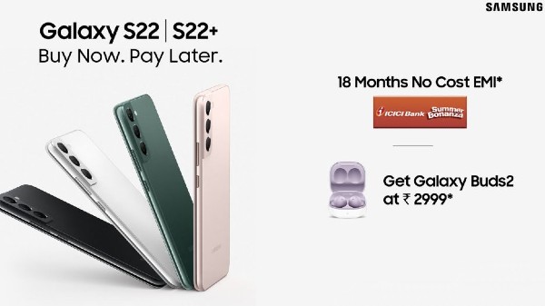 ಇನ್ನು ಸ್ಯಾಮ್ಸಂಗ್ ಕಂಪೆನಿ ತನ್ನ ಪ್ರಮುಖ ಸ್ಮಾರ್ಟ್ಫೋನ್ಗಳಲ್ಲಿ ಜಿರೋ ಡೌನ್ ಪೇಮೆಂಟ್ ಮತ್ತು ಕೇವಲ 1% ಸಂಸ್ಕರಣಾ ಶುಲ್ಕವನ್ನು ಸಹ ನೀಡುತ್ತಿದೆ. ಇದಲ್ಲದೆ ಹೆಚ್ಚುವರಿಯಾಗಿ, ಗ್ಯಾಲಕ್ಸಿ S22 ಅಲ್ಟ್ರಾ 5G ಸ್ಮಾರ್ಟ್ಫೋನ್ ಖರೀದಿಸುವ ಗ್ರಾಹಕರು ಗ್ಯಾಲಕ್ಸಿ ವಾಚ್ 4 ಅನ್ನು ಕೇವಲ 2,999ರೂ.ಬೆಲೆಯಲ್ಲಿ ಖರೀದಿಸಬಹುದಾಗಿದೆ. ಹಾಗೆಯೇ ಗ್ಯಾಲಕ್ಸಿ S22+ ಮತ್ತು ಗ್ಯಾಲಕ್ಸಿ S22 5G ಸ್ಮಾರ್ಟ್ಫೋನ್ ಖರೀದಿಸುವವರು ಗ್ಯಾಲಕ್ಸಿ ಬಡ್ಸ್ 2 ಅನ್ನು 2,999ರೂ.ಗಳಿಗೆ ಪಡೆದುಕೊಳ್ಳಬಹುದಾಗಿದೆ.