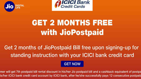 ರಿಲಯನ್ಸ್ ಜಿಯೋ ಮತ್ತು ಐಸಿಐಸಿಐ ಬ್ಯಾಂಕ್ ಸಂಸ್ಥೆಗಳು ಒಪ್ಪಂದ ಮಾಡಿಕೊಂಡಿದ್ದು, ಈ ಒಪ್ಪಂದದ ಪ್ರಕಾರ, ಐಸಿಐಸಿಐ ಬ್ಯಾಂಕ್ ಕ್ರೆಡಿಟ್ ಕಾರ್ಡ್ ಬಳಕೆದಾರರಿಗೆ ಎರಡು ತಿಂಗಳ ಕಾಲ ಉಚಿತ ಜಿಯೋ ಪೋಸ್ಟ್ಪೇಡ್ ಸೇವೆ ಸಿಗಲಿದೆ. ಇದಕ್ಕಾಗಿ, ಐಸಿಐಸಿಐ ಬ್ಯಾಂಕ್ ಕ್ರೆಡಿಟ್ ಕಾರ್ಡ್ ಬಳಕೆದಾರರು 12 ತಿಂಗಳ ಜಿಯೋ ಪೋಸ್ಟ್ಪೇಡ್ ರಿಚಾರ್ಜ್ ಮಾಡಿಸಬೇಕಾಗುತ್ತದೆ.