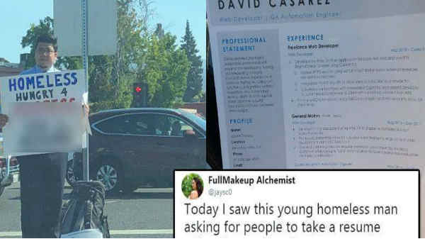 ರಸ್ತೆ ಬದಿ ಹಣ ಬೇಡುವ ಬದಲು, ಈ ಯುವಕ ತನಗೆ ಉದ್ಯೋಗ ಕೊಡಿರೆಂದು ಬೇಡಿ ತನ್ನ ರೆಸ್ಯೂಮ್ ತೋರಿಸುತ್ತಿರುವುದನ್ನು ನಾನಿಂದು ಕಂಡೆ. ಸಿಲಿಕಾನ್ ವ್ಯಾಲಿಯಲ್ಲಿ ಯಾರಾದರೂ ಈತನಿಗೆ ನೆರವಾದರೆ ಅದು ನಿಜಕ್ಕೂ ಒಂದು ಒಳ್ಳೆಯ ಕೆಲಸ. ಆ ಮೂಲಕ ಈ ಡೇವಿಡ್ಗೆ ಬದುಕಿನಲ್ಲಿ ಮೇಲೆ ಬರಲು ಸಾಧ್ಯ ಎಂದು ಮಹಿಳೆ ಮೊದಲ ಟ್ವಿಟ್ ಮಾಡಿದ್ದಾರೆ.