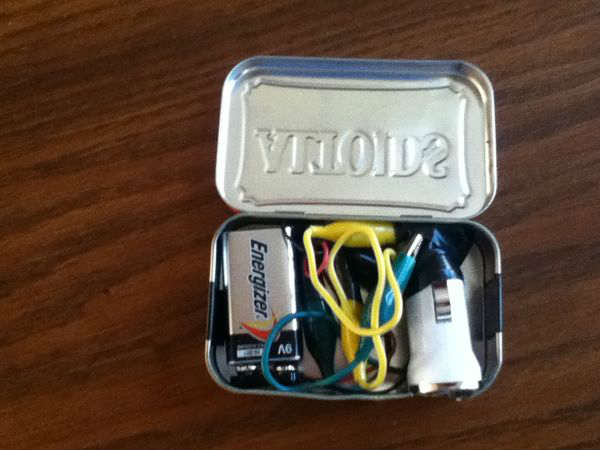 ವೈರಿಂಗ್ ಅನ್ನು ಸೇರಿಸಿ, 9ವಿ ಬ್ಯಾಟರಿ ಮತ್ತು ಕಾರು ಚಾರ್ಜರ್ ಅನ್ನು ಅಲ್ಟಾಯ್ಡ್ಸ್ ಕಂಟೇನರ್ಗೆ ಹಾಕಿರಿ. ಬಳಸಲು, ನಿಮ್ಮ ಫೋನ್ನ ಯುಎಸ್ಬಿ ಚಾರ್ಜರ್ ಕೇಬಲ್ ಅನ್ನು ಯುಎಸ್ಬಿ ಪೋರ್ಟ್ಗೆ ಇನ್ಸರ್ಟ್ ಮಾಡಿ ಅಲ್ಟಾಯ್ಡ್ಸ್ ಕಂಟೇನರ್ನಲ್ಲಿ ಸಣ್ಣದಾದ ತೂತು ಮಾಡಿಕೊಳ್ಳಿ. ನಂತರ ಫೋನ್ಗೆ ಪ್ಲಗಿನ್ ಮಾಡಿ.
