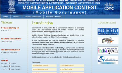 ಮೊಬೈಲ್-ಗವರ್ನೆನ್ಸ್ ಅಡಿಯಲ್ಲಿ ಈ ಸ್ಪರ್ಧೆ ನಡೆಯುತ್ತಿದ್ದು, ಸರ್ಕಾರಿ ಸೇವೆ,ಶಿಕ್ಷಣ,ಸೋಶಿಯಲ್ ನೆಟ್ವರ್ಕಿಂಗ್,ಲೈಫ್ಸ್ಟೈಲ್, ಇ -ಆರೋಗ್ಯ ಕೆಟಗೆರಿಯಲ್ಲಿ ಸ್ಪರ್ಧಾರ್ಥಿಗಳು ಅರ್ಜಿ ಸಲ್ಲಿಸಬಹುದು.