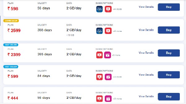 ಜಿಯೋ 199ರೂ. ಪ್ರಿಪೇಯ್ಡ್ ಯೋಜನೆಯು ದಿನಕ್ಕೆ 1.5 ಜಿಬಿ ಡೇಟಾ, ದಿನಕ್ಕೆ 100 ಎಸ್ಎಂಎಸ್ ಮತ್ತು 28 ದಿನಗಳವರೆಗೆ ಅನಿಯಮಿತ ಧ್ವನಿ ಕರೆ ಪ್ರಯೋಜನಗಳನ್ನು ನೀಡುತ್ತದೆ. ಅದೇ ರೀತಿ 555ರೂ. ಪ್ರಿಪೇಯ್ಡ್ ಯೋಜನೆಯು 84 ದಿನಗಳ ವ್ಯಾಲಿಡಿಟಿ ಪಡೆದಿದೆ. 599ರೂ. ಪ್ರಿಪೇಯ್ಡ್ ಯೋಜನೆಯು 2 ಜಿಬಿ ದೈನಂದಿನ ಡೇಟಾ, ದಿನಕ್ಕೆ 100 ಎಸ್ಎಂಎಸ್ ಮತ್ತು 84 ದಿನಗಳ ವ್ಯಾಲಿಡಿಟಿ ಪಡೆದಿದೆ. ಆದರೆ 2,399 ಪ್ರಿಪೇಯ್ಡ್ ಯೋಜನೆಯು ವಾರ್ಷಿಕ ವ್ಯಾಲಿಡಿಟಿ ಪಡೆದಿದ್ದು, ಡೇಟಾ, ವಾಯಿಸ್ ಕರೆ, ಎಸ್ಎಮ್ಎಸ್ ಸೌಲಭ್ಯ ಹೊಂದಿದೆ.