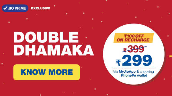 ಜಿಯೋ ಡಬಲ್ ಧಮಾಕಾ ಆಫರ್ ನಲ್ಲಿ ಅನಿಯಮಿತ ಕರೆ, ದಿನಕ್ಕೆ 100 ಉಚಿತ SMS ಮತ್ತು ಡೇಟಾ ಇರಲಿದ್ದು, ಡೇಟಾ ಬ್ಯಾಲೆನ್ಸ್ ಮುಗಿದ ನಂತರ 64KBps ವೇಗದಲ್ಲಿ ಡೇಟಾ ಸಿಗಲಿದೆ.100 ರೂ. ರಿಯಾಯಿತಿ ಜಿಯೋ ಘೋಷಿಸಿರುವ ಡಬಲ್ ಧಮಾಕಾ ಆಫರ್ ನಲ್ಲಿ 300 ರೂ. ಮತ್ತು ಅದಕ್ಕಿಂತ ಹೆಚ್ಚು ರಿಚಾರ್ಜ್ ಮಾಡಿಕೊಂಡರೆ 100 ರೂ. ಡಿಸ್ಕೌಂಟ್ ಸಿಗಲಿದೆ.