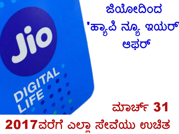 * ಡಿಸೆಂಬರ್ 4 2016 ರಿಂದ ಜಿಯೋದ ಹೊಸ ಗ್ರಾಹಕರು ಡೇಟಾ, ವಾಯ್ಸ್, ವೀಡಿಯೊ ಮತ್ತು ಇತರೆ ಎಲ್ಲಾ ಜಿಯೋ ಅಪ್ಲಿಕೇಶನ್ಗಳನ್ನು ಸಂಪೂರ್ಣ ಉಚಿತವಾಗಿ ಮಾರ್ಚ್ 31 2017 ರವರೆಗೆ ಪಡೆಯಲಿದ್ದಾರೆ.