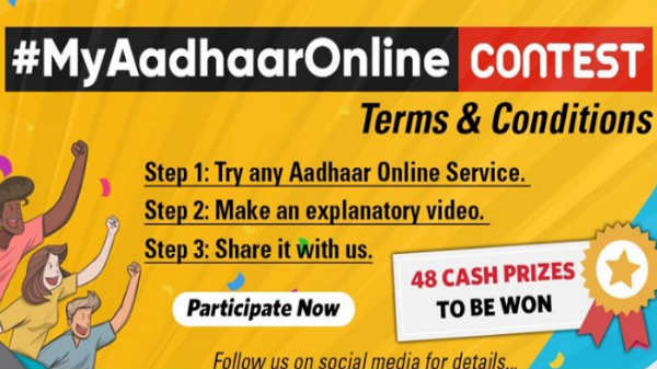 ಯುಐಡಿಎಐ, ಆಧಾರ್ನ ಪ್ರಾಧಿಕಾರವು ಆಧಾರ್ ಕಾರ್ಡ್ ಹೊಂದಿರುವವರಿಗೆ ಹೊಸ ಸ್ಪರ್ಧೆಯನ್ನು ಆಯೋಜಿಸುತ್ತಿದೆ. ಇದರ ಅಡಿಯಲ್ಲಿ ಸ್ಪರ್ಧಿಗಳು ಆಧಾರ್ಗೆ ಸಂಬಂಧಿಸಿದ ಯಾವುದೇ ಆನ್ಲೈನ್ ಸೇವೆಯ ಕುರಿತು ಕಿರು ವೀಡಿಯೊ ಟ್ಯುಟೋರಿಯಲ್ ಮಾಡಿ ಮತ್ತು ಅದನ್ನು ಯುಐಡಿಎಐಗೆ ಕಳುಹಿಸಬೇಕು. ಒಟ್ಟು 48 ವಿಜೇತರನ್ನು ಆಯ್ಕೆ ಮಾಡಲಾಗುತ್ತದೆ ಮತ್ತು ನಗದು ಬಹುಮಾನವನ್ನು ನೀಡಲಾಗುತ್ತದೆ.