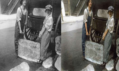 ಮಂಜುಗಡ್ಡೆಯನ್ನು ಸಾಗಿಸುತ್ತಿರುವ ಮಹಿಳೆಯರು ಕಪ್ಪು ಬಿಳುಪು ಫೋಟೋದಲ್ಲಿ