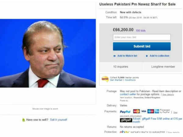 ಈಗಾಗಲೇ 100 ಜನರಿಂದ ಬಿಡ್ ಕೂಗಲಾಗಿದೆ. ಅಂದಹಾಗೆ ಇಂಗ್ಲೆಂಡ್ ನವಾಜ್ ಷರೀಫ್'ರನ್ನು eBay ನಲ್ಲಿ ಹಣ ನಿಗದಿ ಮಾಡಿ ಮಾರಾಟಕ್ಕಿಡಲು ಮುಖ್ಯ ಕಾರಣ ಷರೀಫ್ ನಡೆಸಿದ ಭ್ರಷ್ಟಾಚಾರ.