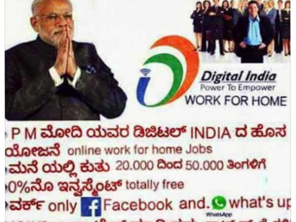 ಹೌದು, ನರೇಂದ್ರ ಮೋದಿ ಅವರ ನೂತನ ಡಿಜಿಟಲ್ ಇಂಡಿಯಾ ಯೋಜನೆ ಮೂಲಕ ಯಾವುದೇ ಬಂಡವಾಳವಿಲ್ಲದೇ ಸಾವಿರಾರು ರೂಪಾಯಿಗಳನ್ನು ಗಳಿಸಿ ಎನ್ನುವ ಜಾಹಿರಾತುಗಳನ್ನು ಸಾಮಾಜಿಕ ಜಾಲತಾಣಗಳಲ್ಲಿ ಹರಿಬಿಟ್ಟು ಜನರನ್ನು ವ್ಯವಸ್ಥಿತವಾಗಿ ವಂಚಿಸುತ್ತಿರುವ ಹಲವು ಜಾಲಗಳು ಸಕ್ರಿಯವಾಗಿವೆ.!!