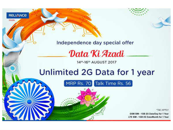 ರಿಲಯನ್ಸ್ ರೂ.70ಕ್ಕೆ ರೀಚಾರ್ಜ್ ಮಾಡಿಸಿದರೆ ಒಂದು ವರ್ಷ ಅನ್ಲಿಮಿಟೆಡ್ ಡೇಟಾವನ್ನು ನೀಡುವುದಾಗಿ ತಿಳಿಸಿದ್ದು, ಇದು 2G ವೇಗದ ಇಂಟೆರ್ನೆಟ್ ಸೇವೆಯಾಗಿರಲಿದೆ.