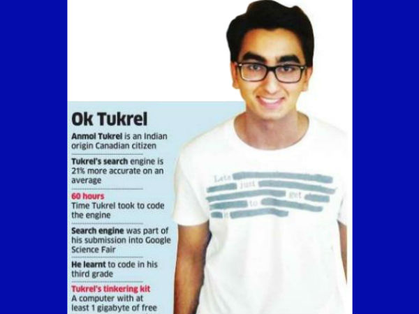 ಭಾರತೀಯ ಮೂಲದ ಕೆನಡಾ ಪ್ರಜೆ 16 ರ ಹರೆಯದ ಅನ್ಮೋಲ್ ತುಕ್ರಾಲ್, ವೈಯಕ್ತೀಕರಿಸಿದ ಸರ್ಚ್ ಎಂಜಿನ್ ಅನ್ನು ವಿನ್ಯಾಸಗೊಳಿಸಿದ್ದು ಇದು ಗೂಗಲ್ಗಿಂತಲೂ 47%ದಷ್ಟು ನಿಖರವಾಗಿದೆ ಎಂಬುದಾಗಿ ದೃಢಪಟ್ಟಿದೆ.